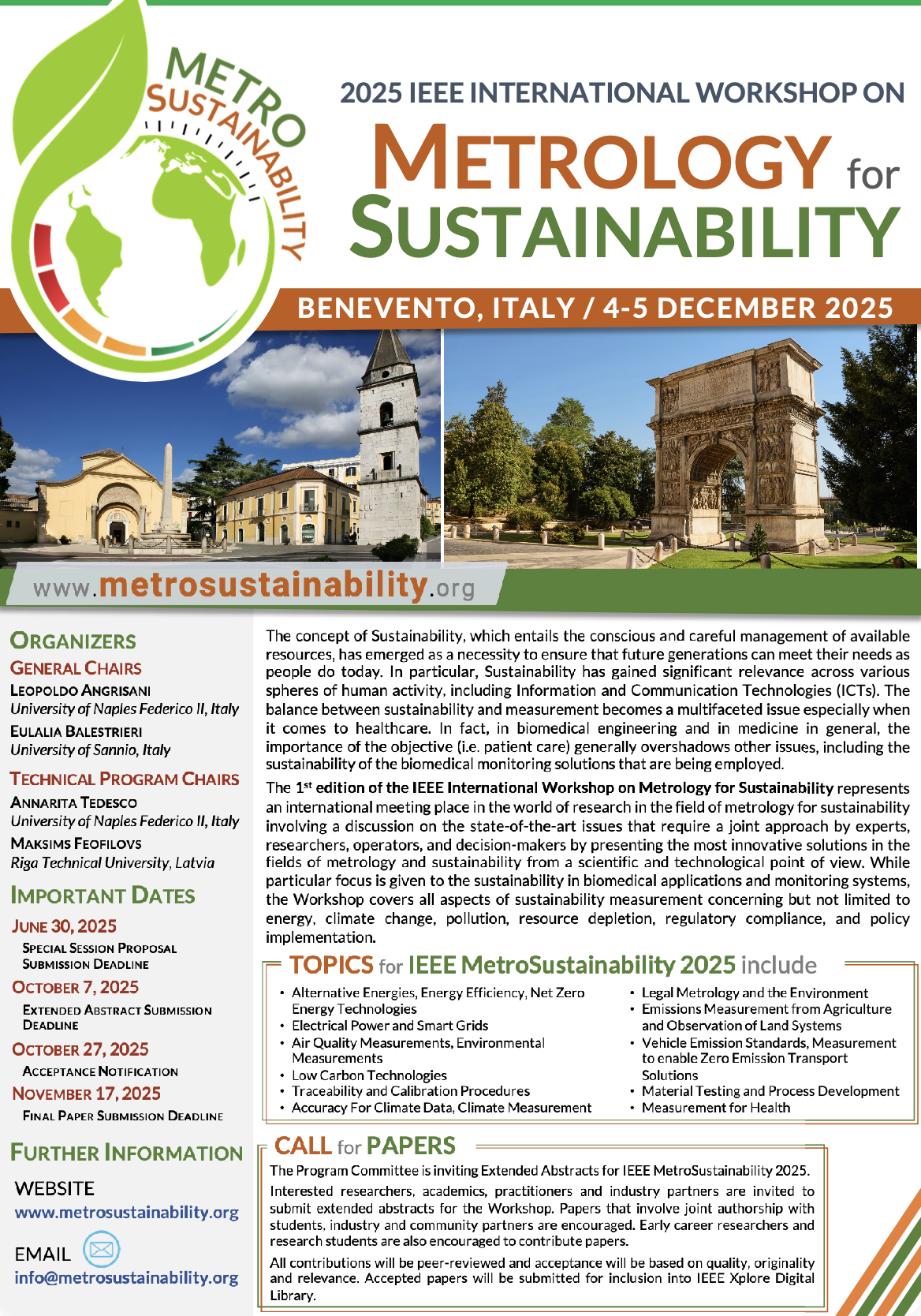The IEEE MetroSustainability 2025 Organizing Committee invites proposals for Special Sessions on new or emerging topics in metrology for sustainability that have the potential to have a major impact on the field in the near future.