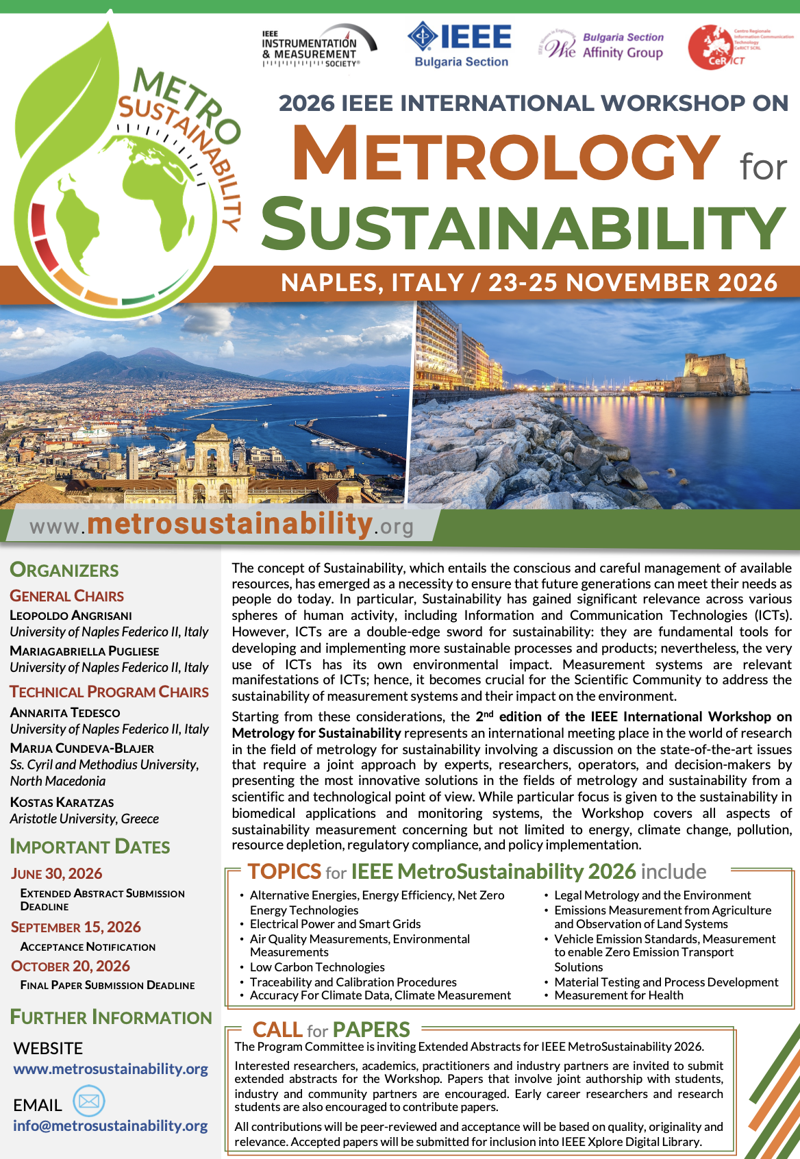 The Program Committee is inviting Extended Abstracts (from 4 to 5 pages) for the IEEE MetroSustainability 2026 Workshop.