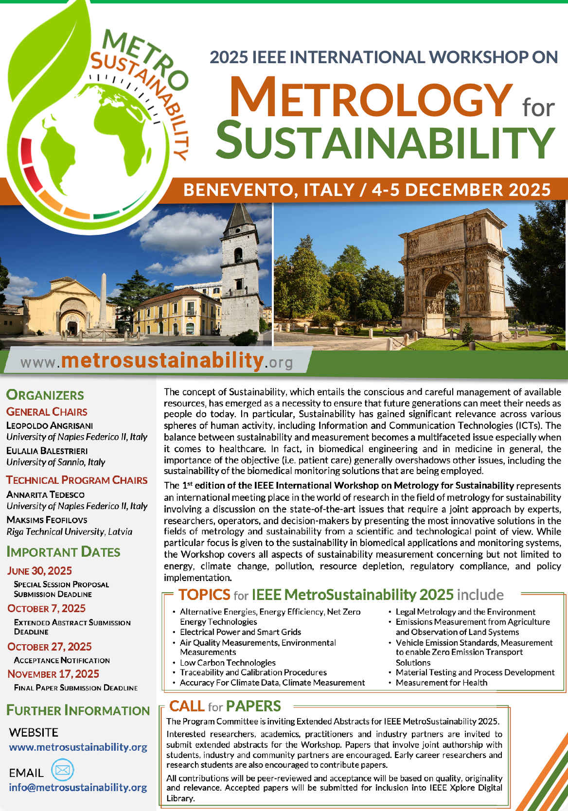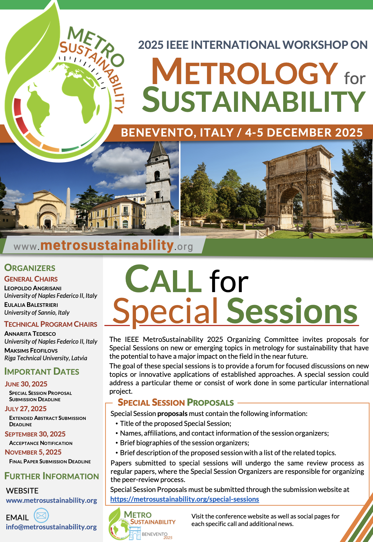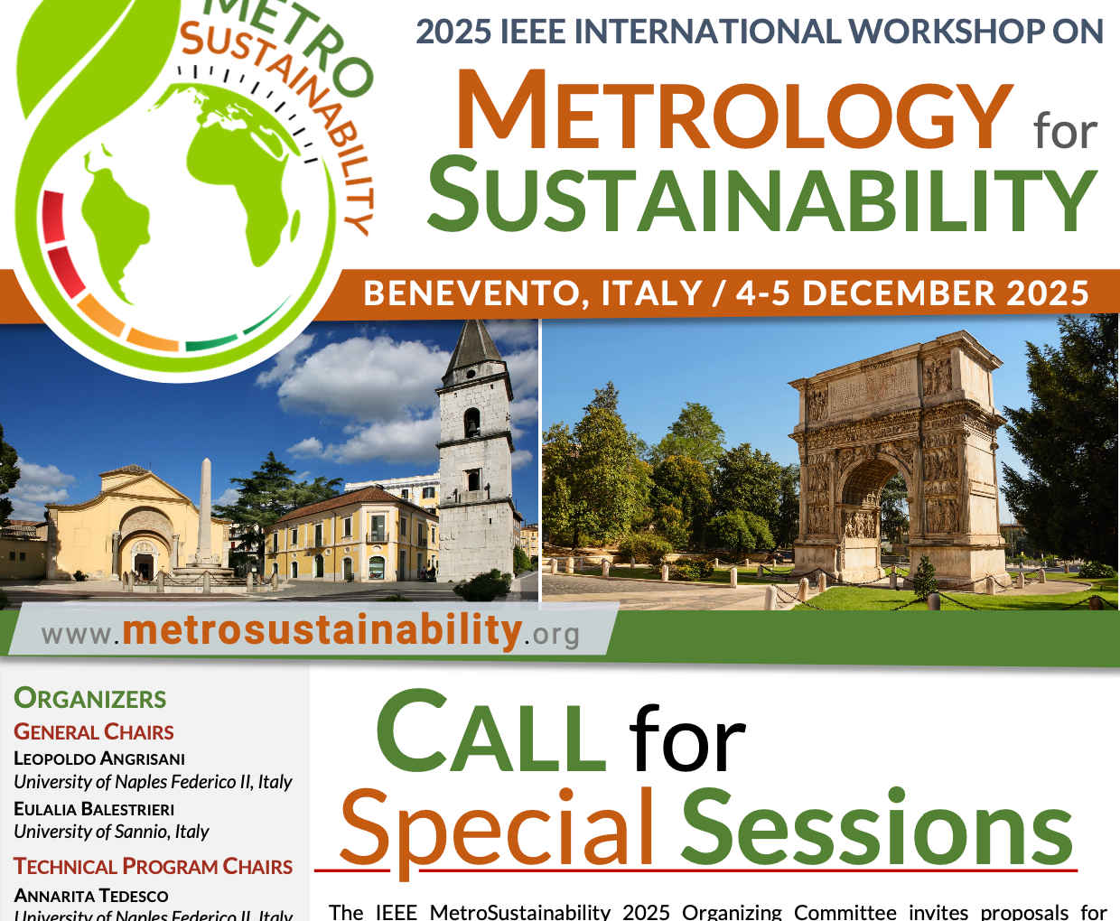 The IEEE MetroSustainability 2025 Organizing Committee invites proposals for Special Sessions on new or emerging topics in metrology for sustainability that have the potential to have a major impact on the field in the near future.